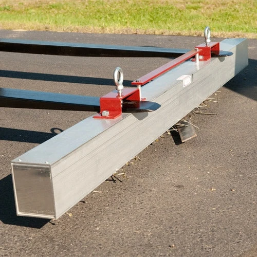 This magnetic sweeper is a hanging model supplied with handles that allow a vehicle or forklift to attach. This model has a length of 60 inches (1524mm) and is identified by the Amf Magnetics part number 89109. It has a retractable handle that allows all swarf and metallic debris to be easily disposed of in a skip or bin without having to touch or scrape the debris from the base of the sweeper.