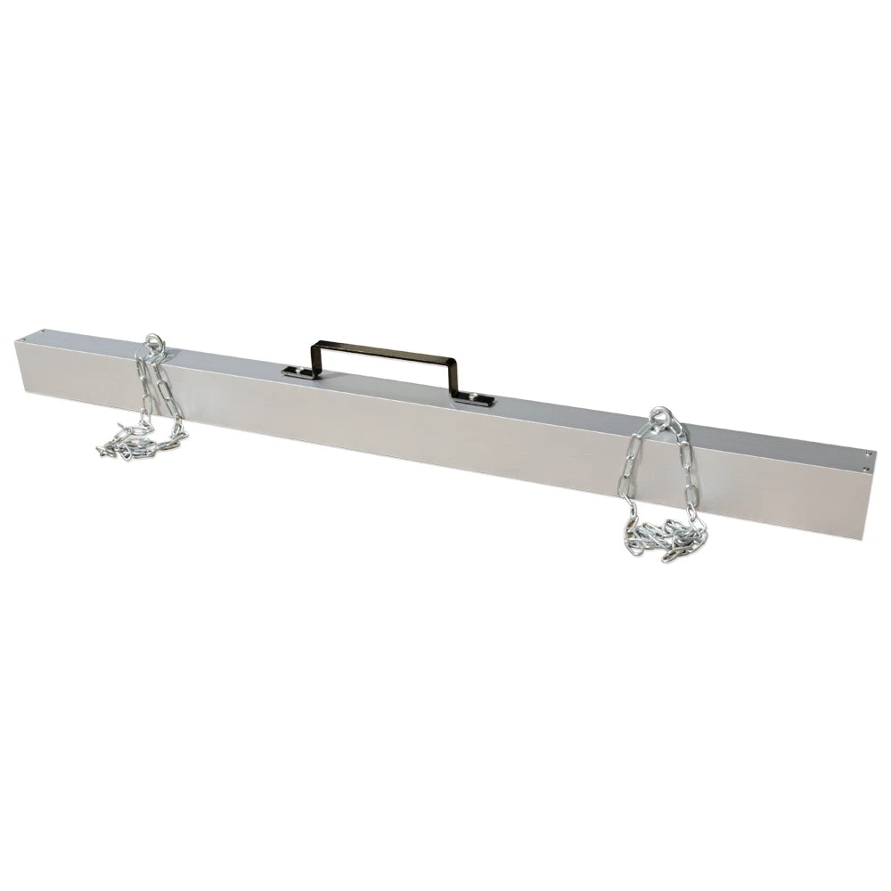 This Self-Cleaning Magnetic Sweeper is a hanging model supplied with chains that allow a vehicle or forklift to attach. This model has a length of 60 inches and is identified by the AMF Magnetics part number 89106A. It has a retractable handle that allows all swarf and metallic debris to be easily disposed of in a skip or bin without having to touch or scrape the debris from the base of the sweeper.