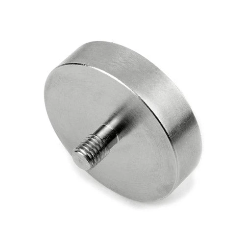 These male threaded Neodymium holding pot magnets are the largest and strongest in our range. Their huge 164kg holding capacity is not for the faint hearted and should be handled with care. They are ideal for industrial applications where a large pull-force or holding strength is suitable. The magnet is housed in a mild steel cap protecting the magnet from damage such as chipping or cracking during use. This steel case also acts to enhance the magnetic power as the magnetic field curves around the inside of the steel cup and both poles are projected through the working face of the magnet. Due to this protective steel cover, Pot Magnets are essentially a single sided magnet.