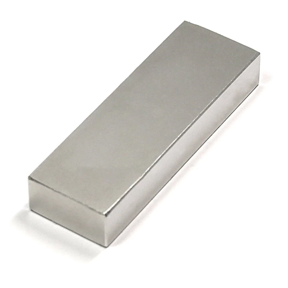 Square, flat Neodymium Block magnets have excellent holding ability when the flat, wide pole surfaces are used to bond with a metal surface. Alternatively, the thin, narrow, non-pole edge of this powerful rectangular magnet can also be used to hold items to a metal surface but make the magnet much easier and quicker to remove or relocate when needed. Considerable care in handling the strong magnet is required to protect the magnet from harsh or sudden impact with a metal surface which can result in the magnet breaking and sustaining irreparable damage. The N45 Grade Neodymium power that is delivered to the wide North and South pole surfaces of this block is relatively high in value and gives the block extremely strong holding ability.