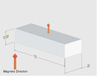 This Rare Earth block magnet has a length of 75mm, a width of 25mm and a thickness of 12.5mm. It is identified by the AMF magnet part number B-W25H12.5L75-N45.
