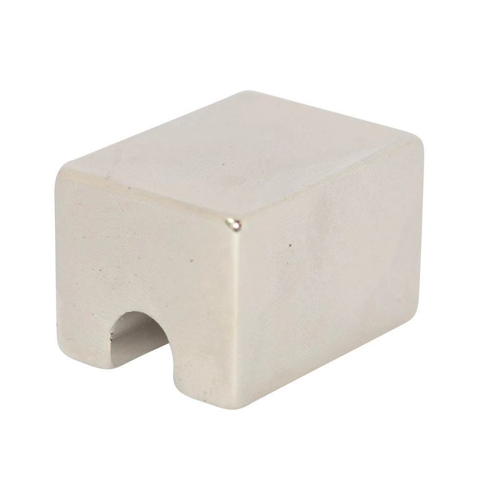 This rectangular block magnet has a length of 30.2mm, a width of 22mm, and a height (or thickness) of 19.1mm. It has a cut-out channel which is 7.3mm in diameter. This magnet has a Gauss reading of 11,300 and a pull force of 21.31 kilograms. This product is identified by the AMF Magnetics part number 93488.