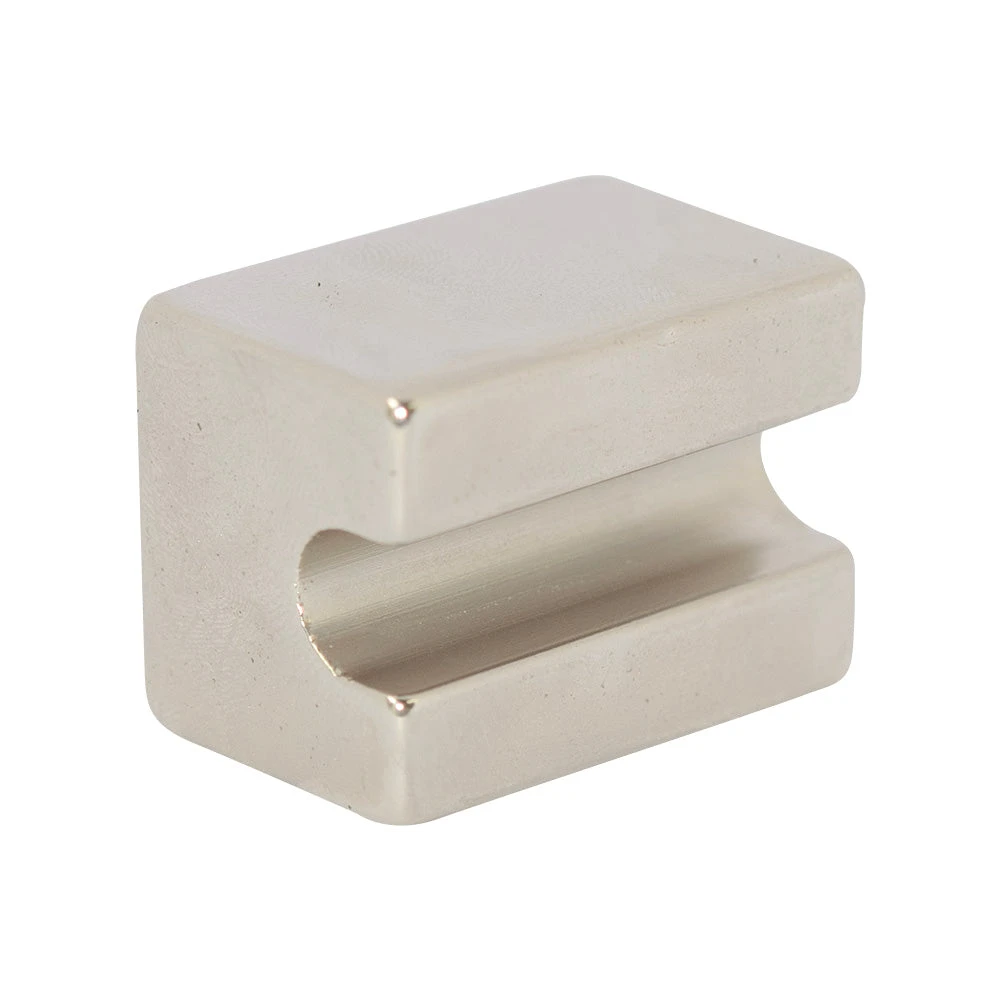 Unlike the majority of block magnets, this item has an unusual direction of magnetisation. The North and South poles are located at each end of the cut-out channel as depicted in the adjacent diagram. The magnetic field travels through the 30.2mm length dimension.