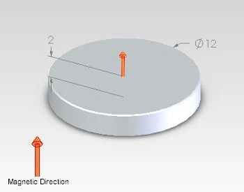 This neodymium magnetic disc has a diameter of 12mm and a height of 2mm. It has a magnetic flux reading of 2087 Gauss and a pull force of 1.52 kilos. It is identified by the AMF magnet part number D-D12H2-N42.
