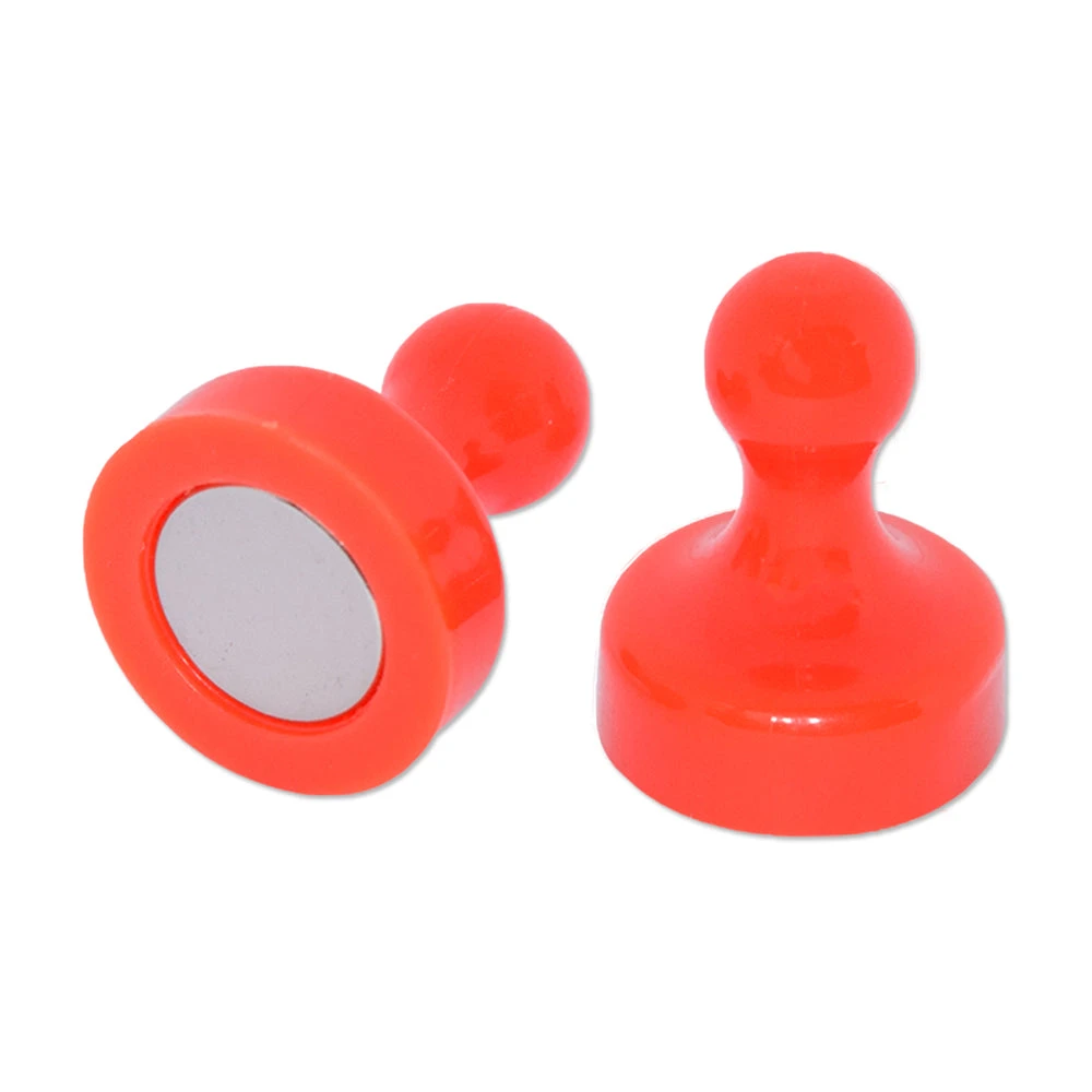 Our strong pin magnets, also called pawn magnets, are made with a Rare Earth Neodymium magnet inserted into their plastic substrate. These whiteboard magnets come in a variety of colours such as Yellow, White, Green, Black, Blue, Purple, and Orange. They are very strong for their size and can hold approximately 10 sheets of A4 pieces of paper to a magnetic whiteboard or metallic surface. Please note: this product may not be compatible with Glass Whiteboards, for more information click here.