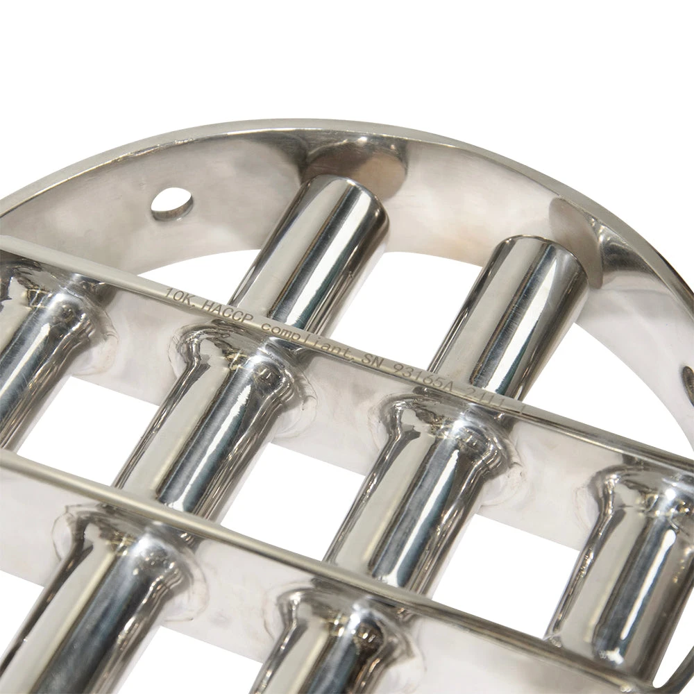 This Fully Welded Round Grate Magnet is designed with powerful Rare Earth Neodymium magnets, providing a minimum magnetic strength of 10,000 Gauss. It features 4 magnet bars, each spaced 50mm apart with a 25mm gap beneath each bar, to ensure maximum efficiency in capturing and removing ferrous particles from your production flow.