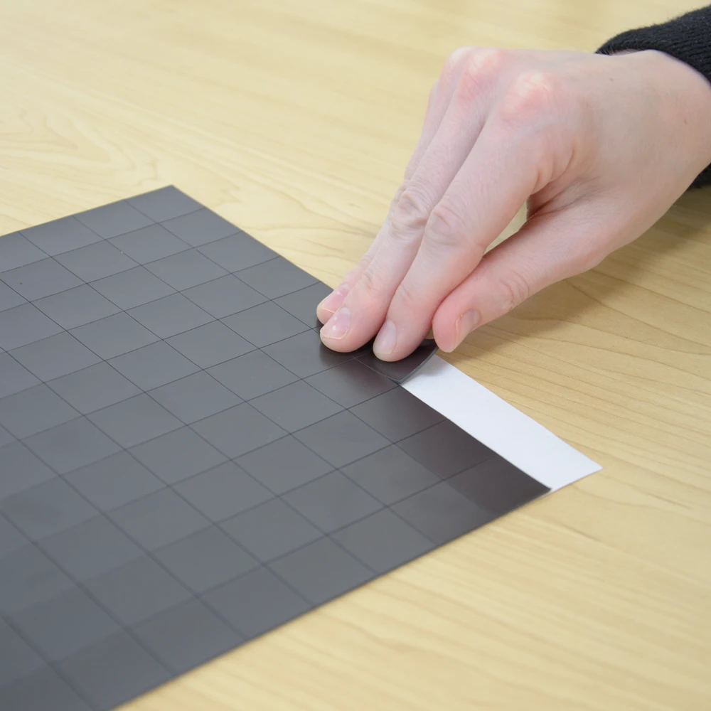 Peeling a square away from its protective backing sheet exposes the self-adhesive surface. This magnetic patch is now ready to be glued to items requiring magnetic suspension to metallic surfaces.